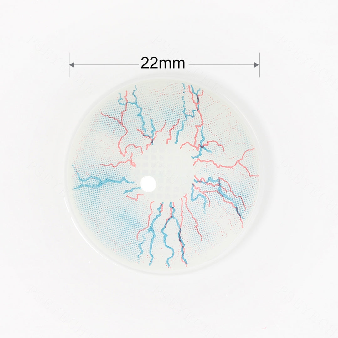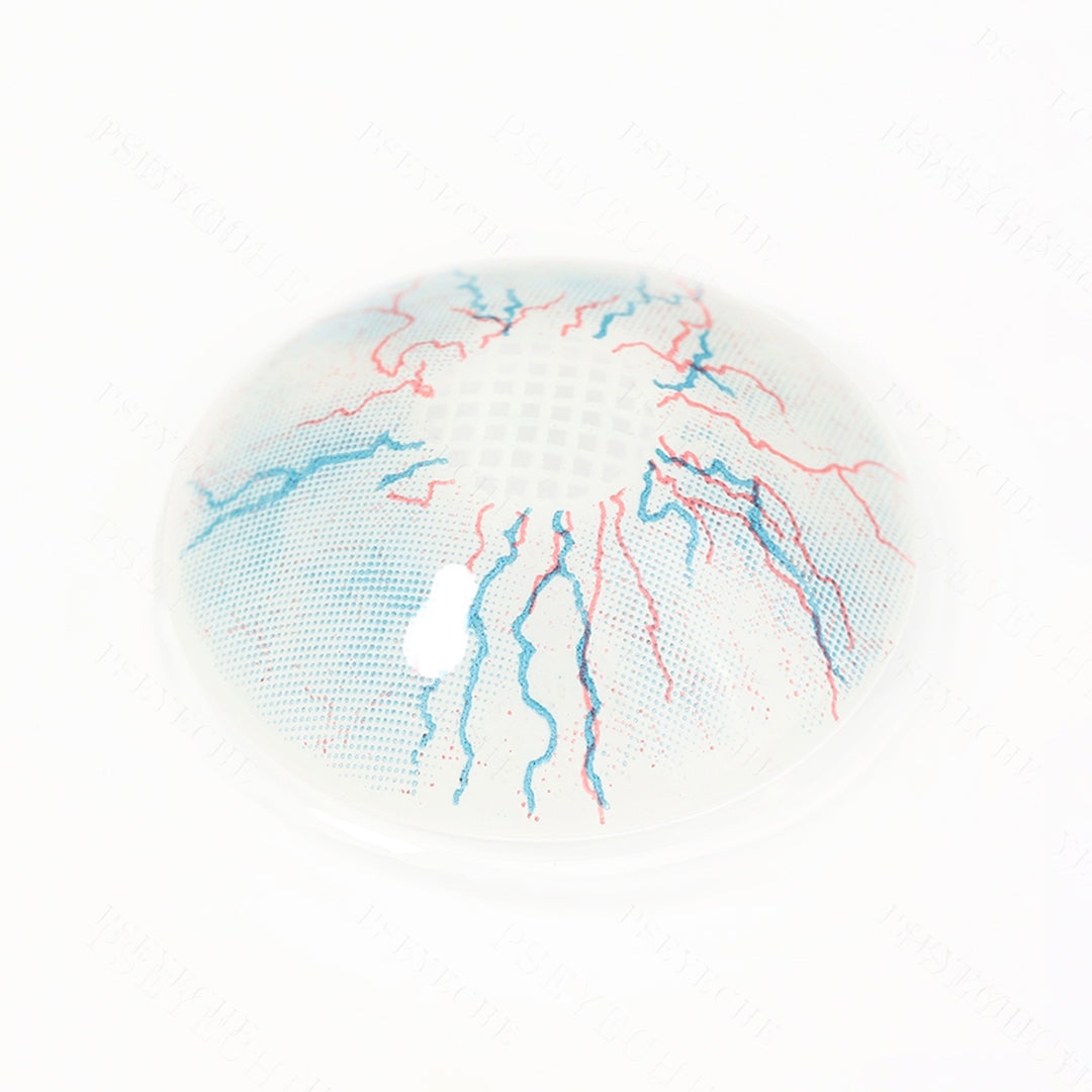 Diese coolen Sklera -Objektive eignen sich für die Rolle eines Charakters in Science -Fiction. Die sich ausbreitende blaue und rote Linie ist genau wie ein Blitz am grauen Himmel.
