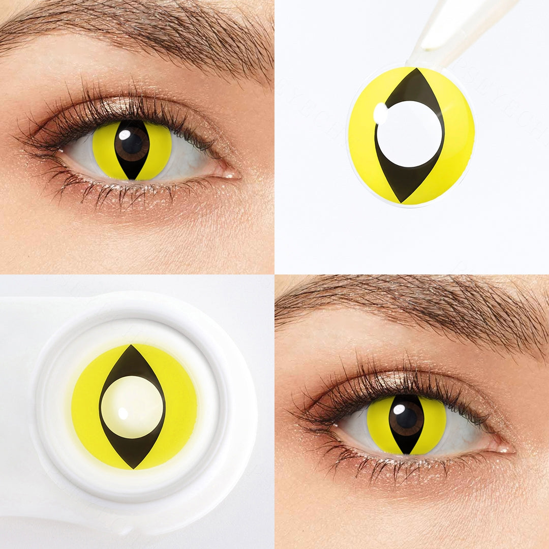 ¿Quieres un par de ojos de gatos glamorosos para que tu disfraz se destaque? La lente de gato amarillo es perfecta para ti. El clásico diseño de pupila vertical negra combina amarillo brillante. Estas lentes de contacto cambiarán por completo los ojos y lo harán más atractivo.